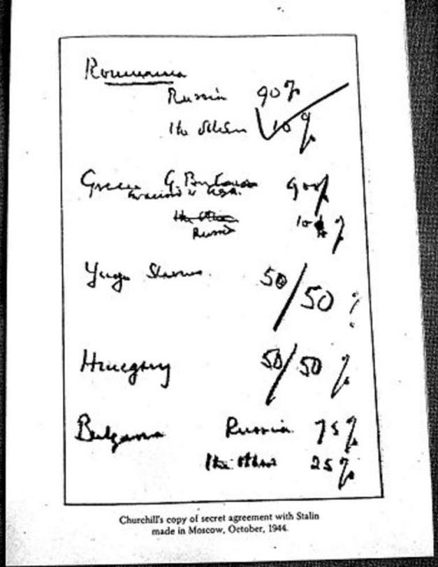 Bucata de hârtie arată controlul, sub formă de procente, pe care sovieticii şi britanicii urmau să îl aibă asupra Bulgariei, Greciei, Ungariei, României şi Iugoslaviei. Documentul va putea fi văzut începând de joi în cadrul unei expoziţii găzduite de Arhivele Naţionale din Londra, potrivit Mail Online.