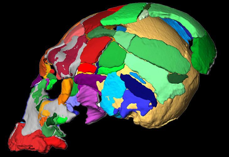Pentru a compara dimensiunile şi formele celor două vechi cranii greceşti, cercetătorii au suprapus o reconstrucţie digitală a feţei şi craniul parţial al unui Neandertal (cu piesele sale recuperate prezentate în diferite culori în foto de mai jos) peste spatele unui craniu de Homo sapiens (prezentat în galben în foto de mai jos). Rezultatele susţin argumentul că cele două cranii nu provin de la aceeaşi specie, afirmă cercetătorii.