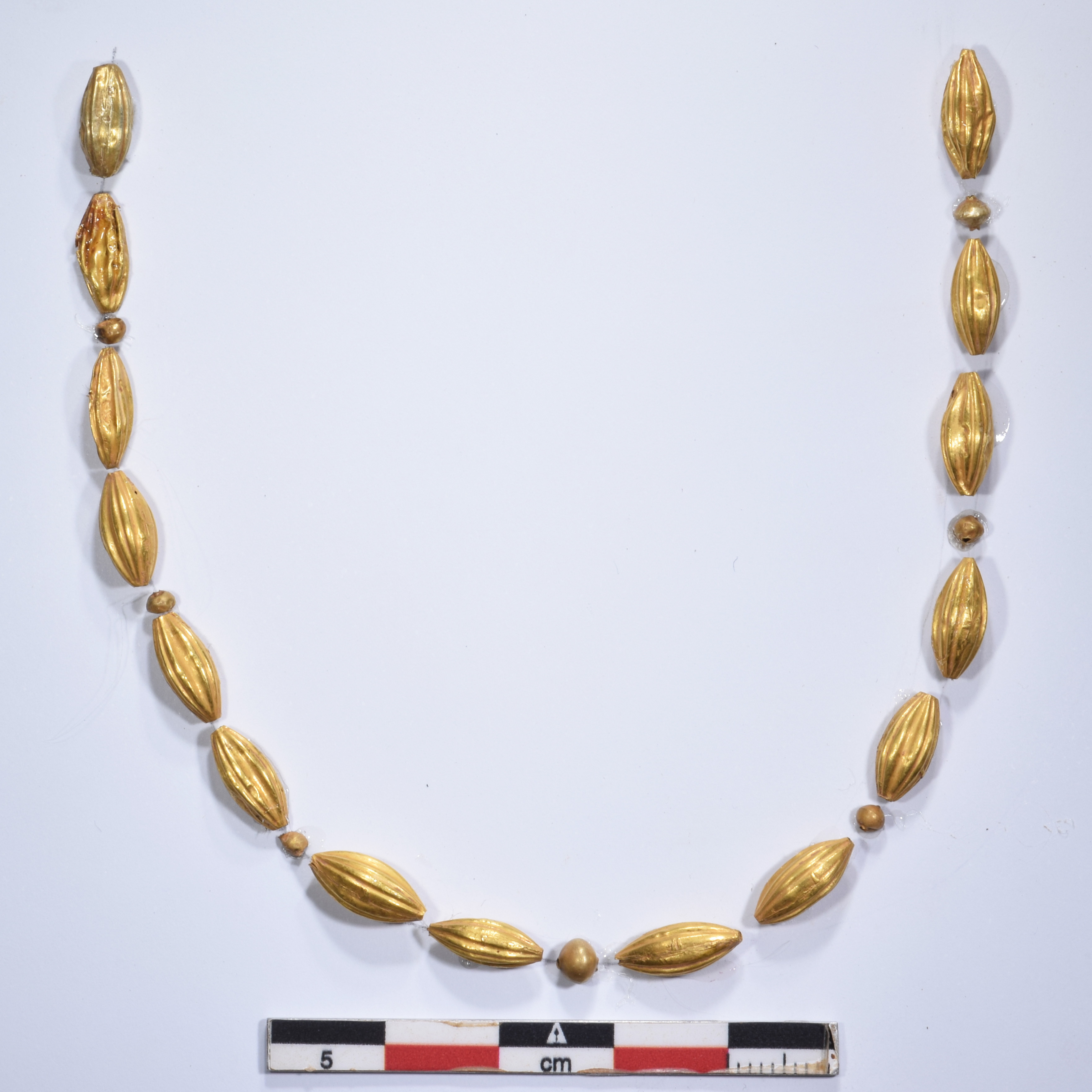 Arheologii au descoperit un mormânt rectangular, cu pereţii din piatră, în interiorul unei structuri construite într-o perioadă anterioară celei în care ocupanta mormântului a fost înhumată. Oamenii de ştiinţă aproximează că respectiva structură a fost construită în intervalul 1750-1490, perioada mijlocie a civilizaţiei minoice. În interiorul mormântului, arheologii au descoperit scheletul unei femei adulte, alături de care au fost aşezate o oglindă din bronz cu mâner de fildeş, bijuterii din os şi bronz, precum şi un colier cu mărgele din aur.