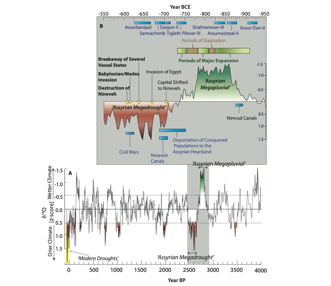 Folosind studierea izotpilor de oxigen şi a celor de uraniu-thorium, cercetătorii au observat că expansiunea Imperiului Neo-Asirian a avut loc într-o perioadă în care nivelul mediu al precipitaţiilor a fost neobişnuit de mare. Această perioadă megapluvială, cum au numit-o cercetătorii, a fost urmată de o periodă de secetă. Datele arată că această perioadă de secetă seamănă cu secetele care au loc în regiune în prezent, cu diferenţa importantă că Imperiul a trecut printr-o perioadă de secetă care a durat câteva decenii.
