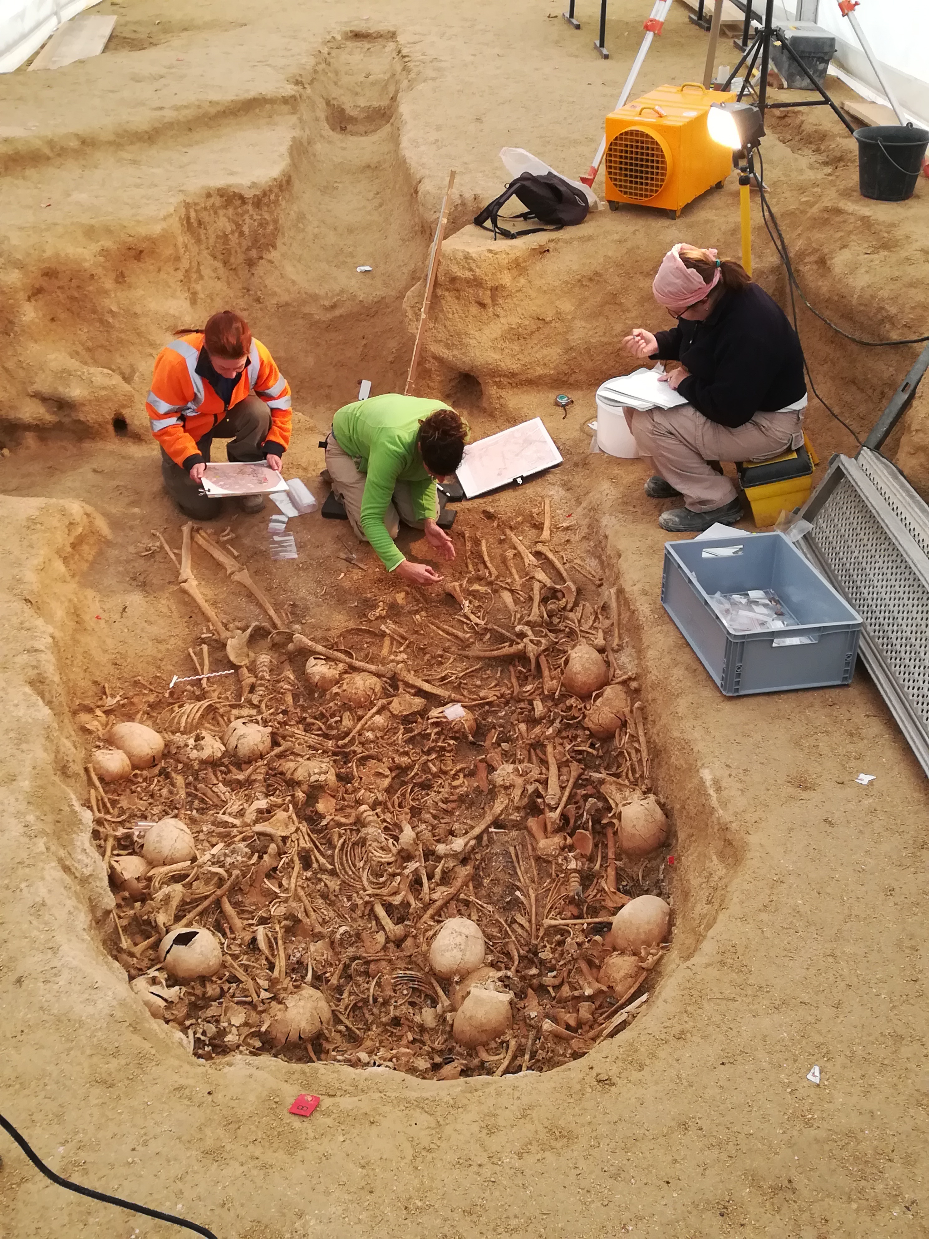 În interiorul camerei mortuare, cele 2.000 de oase care aparţin unor persoane de toate vârstele şi sexele sunt depozitate în starturi, în următoarele luni, arheologilor de la INRAP revenindu-le sarcina de a le inventaria şi studia. Ei speră că astfel vor înţelege mai bine modul în care aceste persoanele au fost depozitate după deces şi modul în care oasele au fost organziate după descompunerea ţesuturilor moi. De asemenea, analizele genetice vor duce la înţelegerea relaţiilor de rudenie între persoanele îngropate în acest hipogeu.