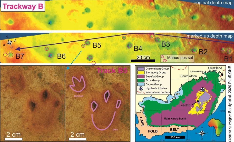În cadrul acestei cercetări, Bordy şi colegii ei au descris şi identificat amprentele conservate în straturile de gresie depozitate între scurgerile de lavă, cu o vechime de 183 de milioane de ani. Este vorba de 25 de amprente de la trei tipuri de animale: 1) sinapside potenţial mici, un grup de animale care include mamifere şi predecesorii lor; 2) dinozauri mai mari, bipezi, probabil carnivori; 3) dinozauri erbivori mici, patrupezi, reprezentaţi de o nouă ichnospecie (specie care este cunoscută doar după urmele de fosile, precum amprentele).