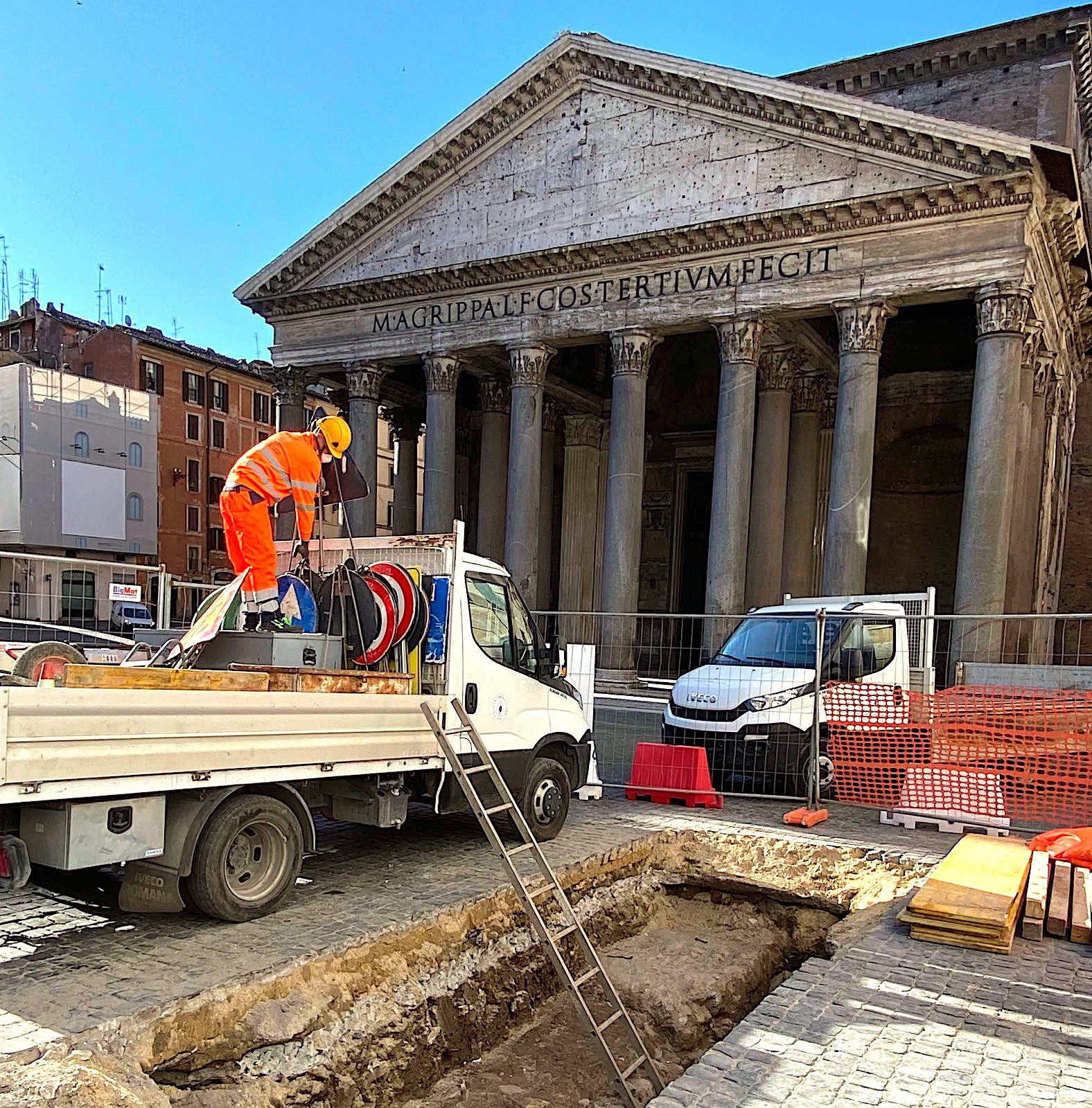 Recent, în pavajul din piaţa Panteonului a apărut o gaură, pe care arheologii au excavat-o.
