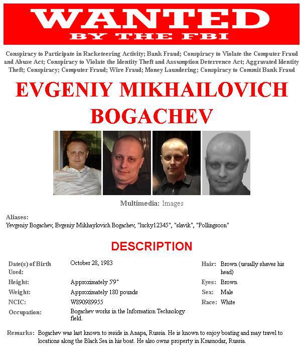 Poliţia federală americană îl caută pe Bogacev care este acuzat în Statele Unite de un comiterea unor atacuri informatice prin intermediul reţelei GameOver Zeus, prin care ar fi furat peste 100 de milioane de dolari din conturi bancare online.