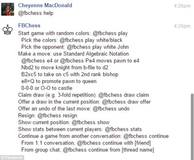 Pentru a putea accesa FBChess, aşa cum a fost denumit jocul, este nevoie ca un utilizator să iniţieze o conversaţie, trimiţându-i interlocutorului său mesajul „@fbchess play”. În acel moment, programul va fi iniţializat şi va atribui, în mod automat, spaţiile albe celui care a început jocul, permiţându-i să facă prima mutare.