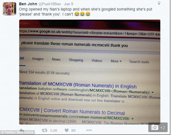 „Te rog converteşte aceste cifre romane MCMXCVIII mulţumesc”, era căutarea tastată de bunică, urmată de răspunsul „1998″.