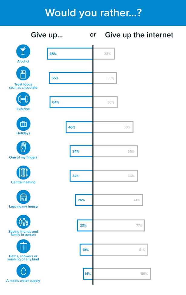 Un procent de 34% dintre persoane au declarat că ar putea renunţa la încălzire atâta timp cât ar avea conexiune la internet. Mult mai uimitor este faptul că unii au declarat că ar renunţa la un deget pentru a avea acces la internet. Aproximativ unul din cinci (19%) au afirmat că ar putea rezista toată viaţa fără să se spele.