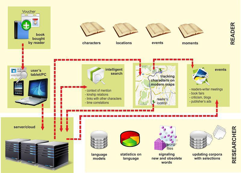 Cum ar funcţiona cartea smart? Se descarcă aplicaţia pe telefonul sau tableta utilizatorului. Odată descărcată, va genera automat „scheme” inteligente ale informaţiei din carte, bazate pe înţelegerea textului de către maşină. În funcţie de locaţia cititorului şi de momentul în care citeşte, îi recomandă vizitarea locaţiilor din carte, marchează traseele pe care le-au făcut personajele cărţii, anunţă evenimente legate de lectură şi permite comunicarea cu alţi cititori.