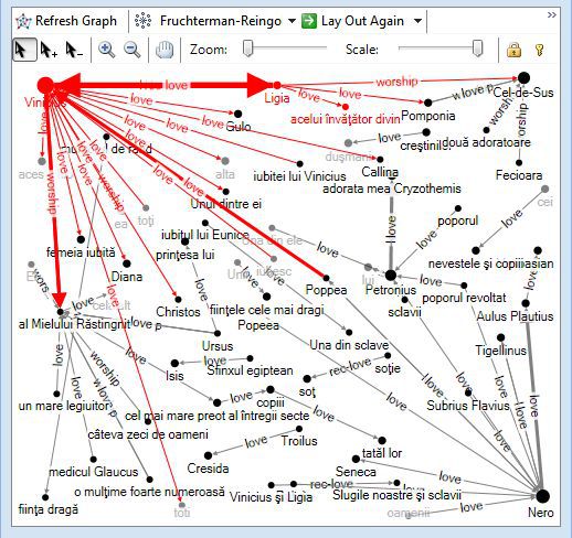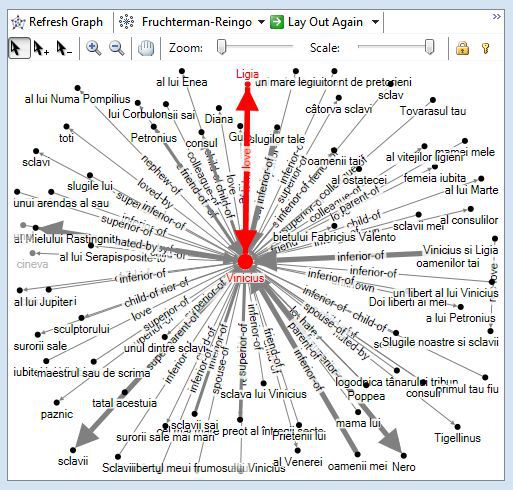Relaţiile din Quo Vadis au fost marcate manual de către studenţi şi profesori, pentru a antrena programul să le recunoască pe viitor. În imagine apar: diagrama relaţiilor afective dintre personaje; diagrama relaţiilor personajului principal, Vicinius; statistica relaţiilor personajului principal, Vicinius.