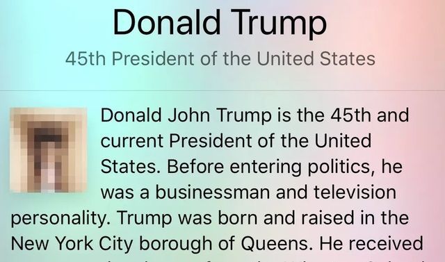 Întrebat orice despre Donald Trump, Siri oferă rezultate de pe pagina de Wikipedia a preşedintelui Americii. Astfel, aproape oricine poate modifica acele informaţii, iar în perioada în care acestea nu sunt întoarse de către cineva manual la forma iniţială, erorile pot fi afişate fără a fi verificate. Astfel, nu mică a fost surprinderea utilizatorilor de iOS atunci când au cerut informaţii despre Trump, iar în locul fotografiei acestuia, a fost afişată o imagine cu un penis, scrie Go4it.