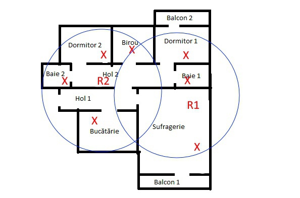 Observă numărul de pereţi care separă fiecare X din perimetrul desenat pe schiţa locuinţei şi încearcă să alegi o locaţie ideală pentru routerul de reţea de reţea, ţinând cont de următoarele criterii: