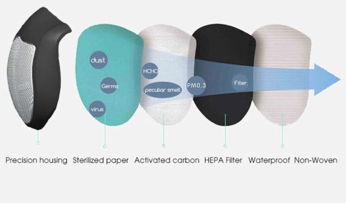 Masca de sterilizare electrică Xiaomi Youpin Q5S are patru filtre, dintre care unul HEPA (filtru de aer de înaltă eficienţă), unul metalic, altul din hârtie sterilă care previne germenii şi ultimul strat confecţionat din ţesătură impermeabilă care previne umiditatea.