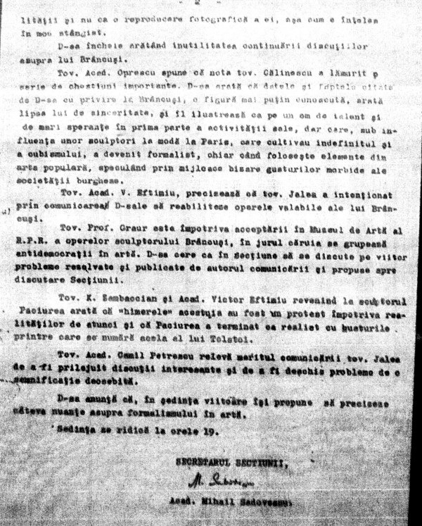Tov. Prof. Graur este împotriva acceptării în Muzeul de Artă al R.P.R. a operelor sculptorului Brâncuşi, în jurul căruia se grupează antidemocraţii în artă. D-sa cere ca în secţiune să se discute pe viitor probleme rezolvate şi publicate de autorul comunicării şi propuse spre discutare Secţiunii.