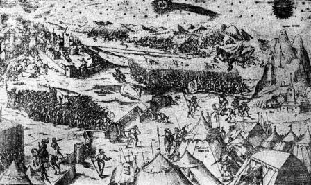 Mai mult, la aproape noua decenii de la aceasta prima mentiune, o alta a facut valva in toata Europa occidentala. Este vorba despre atacul din 15 octombrie 1595 al lui Mihai Viteazul asupra orasului Targoviste, oras aflat pe atunci sub ocupatie otomana, si in care, pe langa faptele de arme, este mentionat un eveniment aparte. Nu numai cronicile valahe, dar si cele italiene sau germane au preluat informatia, anume aparitia unei „comete” bizare care a stat tintuita pe cer, deasupra taberei muntene, timp de „un ceas sau doua”, pentru ca apoi sa dispara fara urma. Trebuie mentionat faptul ca aparitia cometelor era strict observata si notata in arhivele vremii de catre astronomii europeni. Si totusi, nicio cometa nu pare sa fi trecut, in mod natural, pe cerul Valahiei in anul 1595.