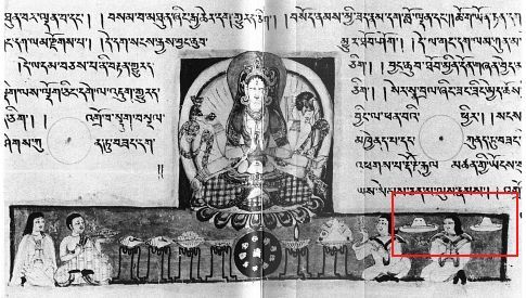 Aceasta imagine provine din gama de ilustratii a textului tibetan din secolul al X-lea, scris in limba sanskrita, „Prajnaparamita Sutra”, tinut in prezent intr-un muzeu japonez. Se pot observa cu usurinta doua obiecte asemanatoare cu niste palarii care, insa, par sa zboare prin aer.