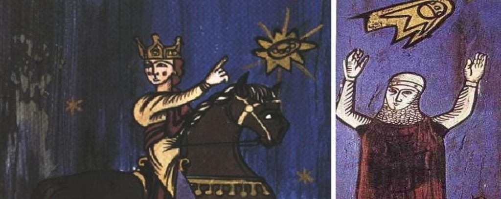 Acest desen provine dintr-un manuscris scris in jurul secolului al XII-lea, denumit „Volume despre Evenimente Istorice si Religioase”. Textul relateaza iar imaginile ilustreaza asediul saxonilor asupra castelului Sigiburg, din Franta, in anul 776. Atacatorii ii inconjurasera complet pe francezii medievali, atunci cand lumini ciudate au aparut pe cer, deasupra unei biserici din apropiere. Presupunand ca francezii sunt protejati de aceste obiecte, saxonii s-au speriat si au renuntat la atac.