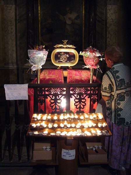 Moaştele Sfântului Valentin sunt păstrate în mai multe lăcaşuri de cult. Craniul încununat cu flori al martirului este expus în Bazilica Sf. Maria din Roma, în timp ce alte moaşte au ajuns la o biserică din Dublin.