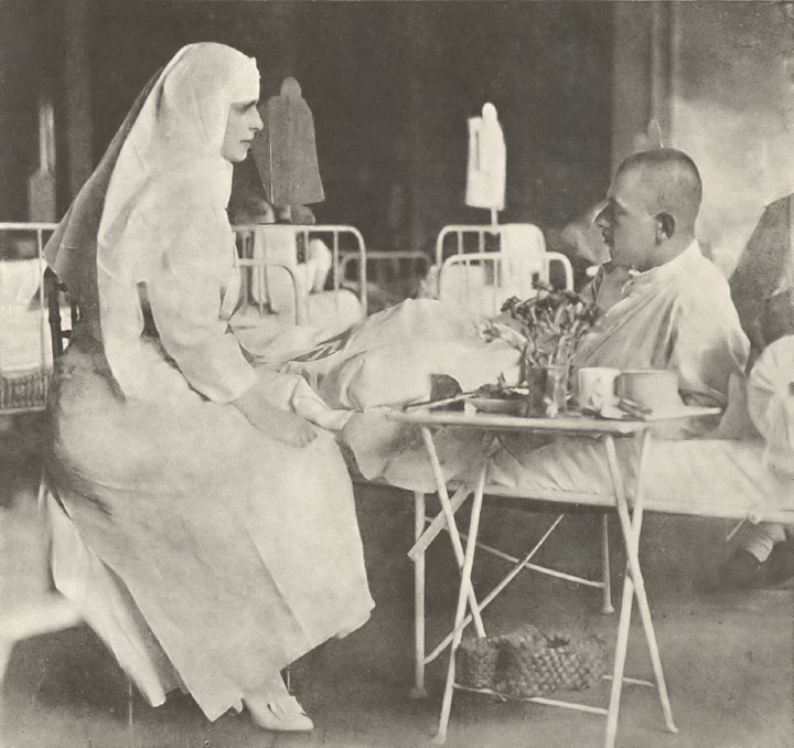 În timpul Primului Război Mondial, îmbrăcată în haine de soră medicală, Regina Maria a organizat spitalele de campanie şi a fost prezentă printre cei suferinzi, împărţind medicamente, mâncare şi pături soldaţilor răniţi pe front sau bolnavilor de tifos. Pentru atitudinea sa curajoasă din timpul Primului Război Mondial a primit titlul de „Regina – soldat”.