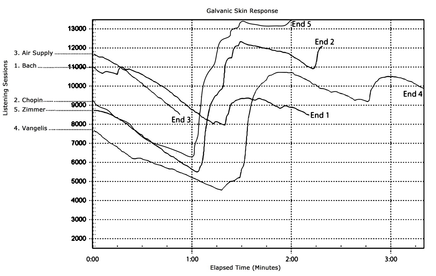 Grafic în care sunt marcate reacţiile unui ascultător la melodiile folosite în experiment (Foto:sciencealert.com/Amani El-Alayli)