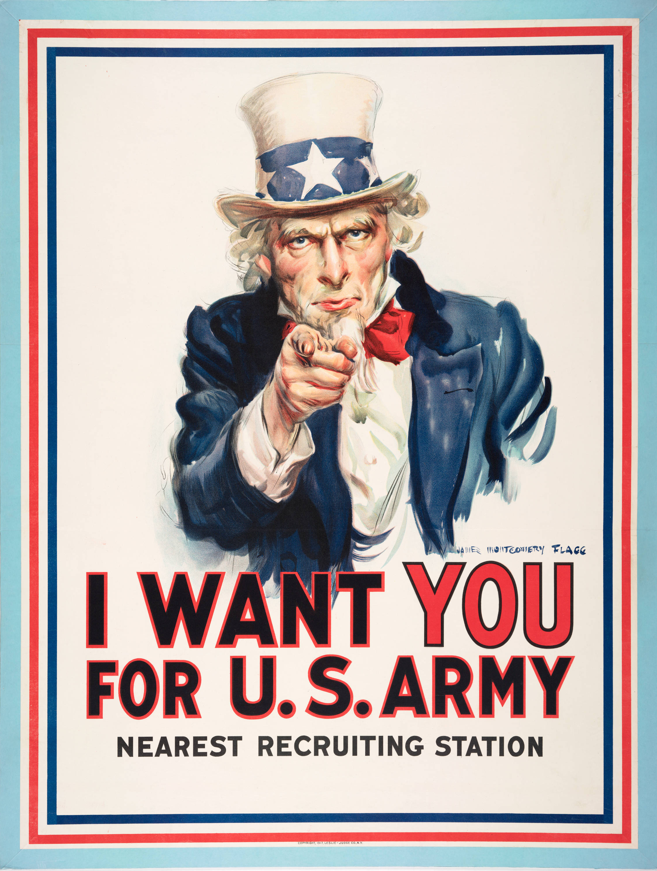 Figura lui Uncle Sam a devenit simbol naţional odată cu apariţia, în 1916, a autoportretului lui James Montgomery Flagg. Această imagine a folosită ulterior în celebrul poster de recrutare pe care era inscripţionat ,,I want you for U.S. Army” (,,Te vreau în Armata Americană!”).