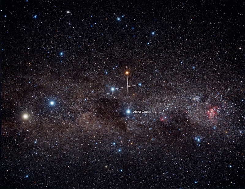 Aici nu poţi vedea nici carele şi nici Steaua Polară, dar găseşti constelaţia Crucea Sudului, numită şi constelaţia Crux. Cele patru stele din marginea crucii sunt cele mai luminoase. În stânga crucii, ar trebui să se observe două stele luminoase, ca în imaginea de mai jos. Ca în cazul precedent, dacă ştii poziţia unui punct cardinal, le ştii pe toate, doar că de data aceasta, vestul este în dreapta, estul în stânga şi nordul în spate.