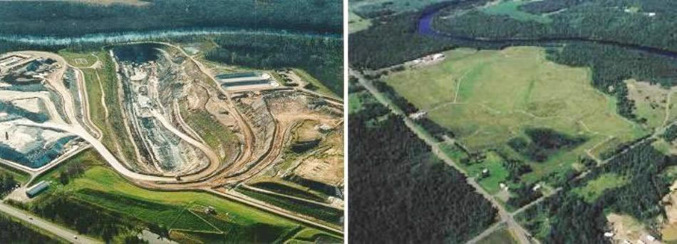 - La mina de aur şi cupru Flambeau (fotografia de mai jos), din statul american Wisconsin, operaţională între anii 1993-1997, conform reglementărilor stabilite, compania proprietară, care s-a ocupat şi de lucrările de reabilitare, este răspunzătoare de ceea ce se întâmplă acolo timp de încă vreo câteva decenii bune, urmând să monitorizeze parametrii mediului şi succesul proiectului de reabilitare timp de 40 de ani după iniţierea acestuia. Aici s-a realizat, practic, un proiect de reconstrucţie ecologică, locul fiind readus aproximativ la starea sa de odinioară (de dinaintea începerii exploatării): a fost recreat peisajul originar, cu mlaştini şi 50 de hectare de prerie, populată cu specii native de plante. Iar pentru a stimula turismul local, au fost croite poteci ce formează un traseu turistic cu lungimea de 7 km.