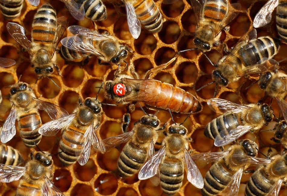 Matca (cea cu numărul 29 „pe tricou”, în fotografia de mai jos) e mama întregii colonii, singura femelă fertilă, care are de făcut doar o treabă, importantă, ce-i drept: să depună ouă. Lucrătoarele, care fac toate celelalte treburi din stup, sunt femele sterile, provenite din larve hrănite cu polen, în vreme ce regina provine dintr-o larvă hrănită cu lăptişor de matcă. Polenul este o aglomerare de granule microscopice, care conţin celulele reproducătoare masculine ale plantelor cu flori. E un concentrat de substanţe nutritive, cu care albinele hrănesc puietul destinat să se transforme în lucrătoare şi trântori.
