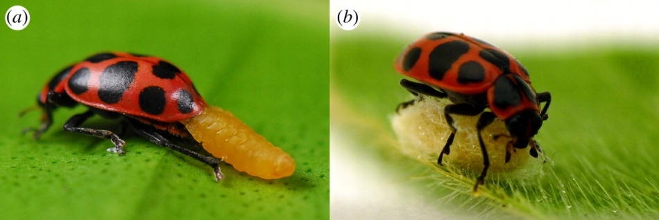 Buburuza din imaginile de mai jos pare că îşi protejează odrasla, dar în realitate ea adăposteşte urmaşul unui parazit.