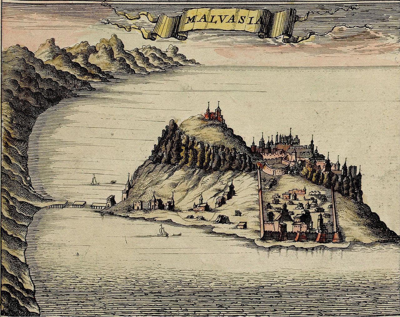 Monemvasia este legată de ţărm printr-un pod şi are astfel „o singură intrare”, aşa cum se şi traduce din greacă numele insulei.