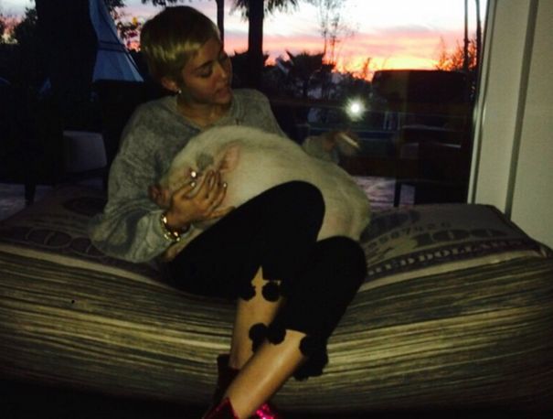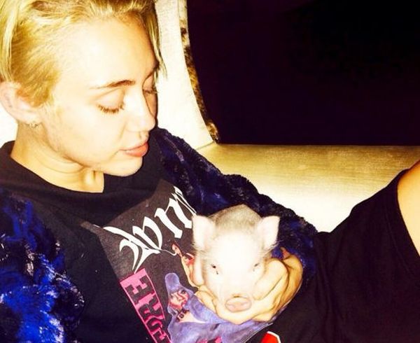 Miley Cyrus a fost una dintre multele celebrităţi care a fost cucerită de moda porcuşorului de companie. Ea chiar a postat, pe contul său de Instagram, mai multe fotografii cu adorabilul „pitic” care a tot crescut până a ajuns să aibă dimensiuni impresionante.