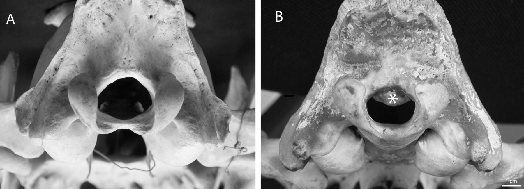 Imaginea A demonstrază un craniu al unui leu sănătos, iar Imaginea B prezintă creşterea osoasă anormală (marcată cu un asterisc).
