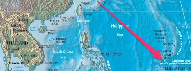 Acesta este cel mai adânc loc de pe Planetă, de 2.400 km lungime şi aproximativ 65 km lăţime şi se află în adâncimea Oceanului Pacific, la est de Filipine şi la sud de Japonia, în apropiere de insula Guam.  Adâncimea acestei gropi este de mai mult de 11 km sub apă. National Geographic a subliniat: „Dacă Muntele Everest ar fi fost introdus în Groapa Marianelor, vârful muntelui ar fi continuare mai mult de 1,5 km sub apă”.