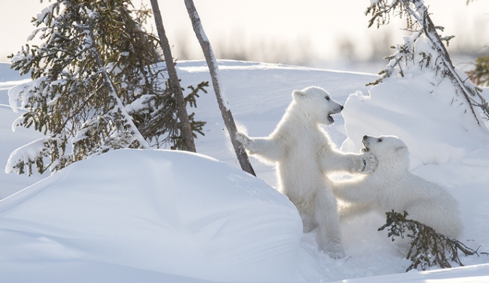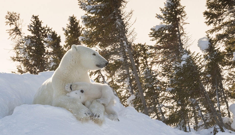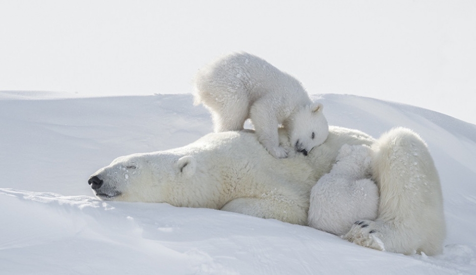 Urşii polari încep să iasă din peşteri împreună cu puii lor de patru luni. Ursuleţii ies atunci din bârlog pentru prima dată.