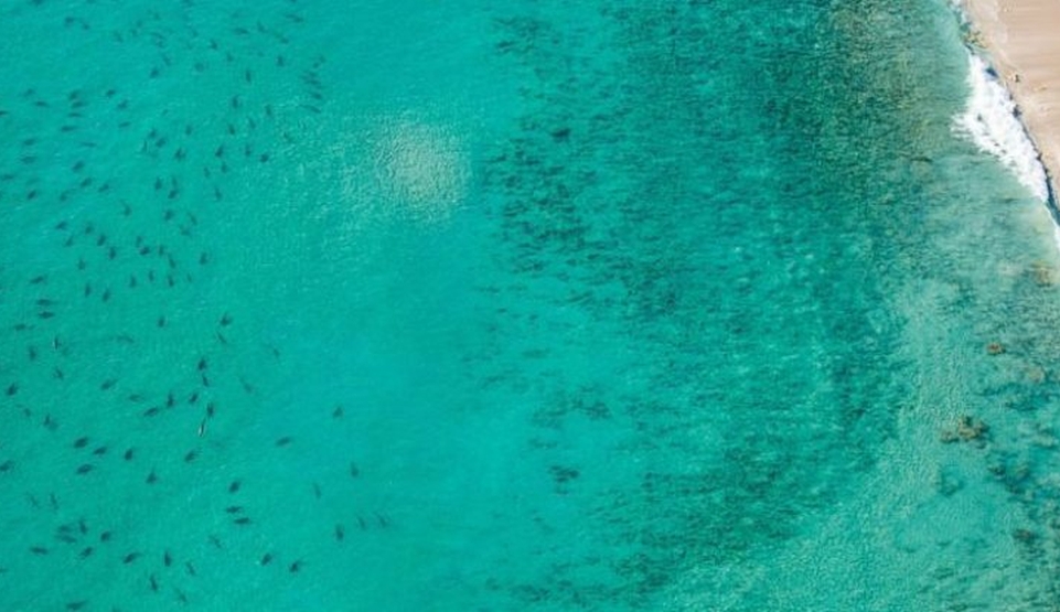 Pentru această specie, este absolut normal de a migra în masă spre apele mai calde în lunile de iarnă, dar în acest an rechinii au ajuns mult mai la nord decât de obicei, la numai 100 de metri de ţărm, după cum se poate vedea în această imagine incredibilă de mai jos.