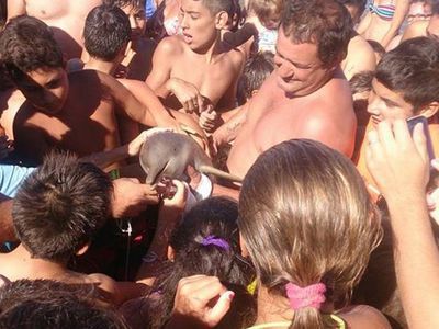 Doi delfini din specia Franciscana (La Plata) au fost scoşi din ocean de turişti, săptămâna trecută, pe o plajă din Argentina.