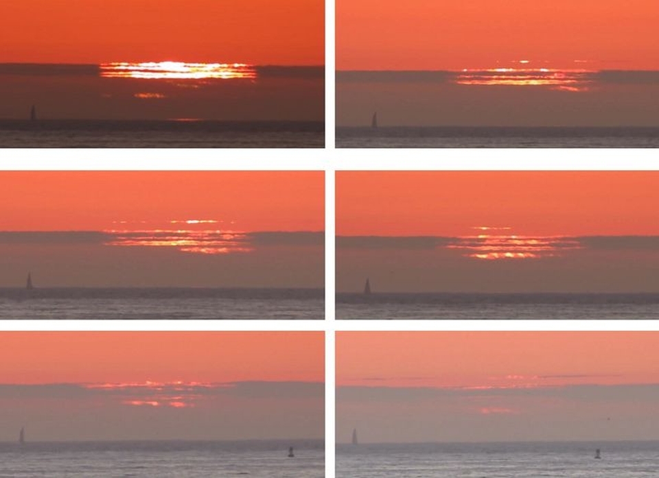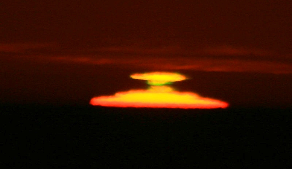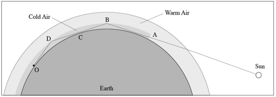 Razele luminii solare pătrund în stratul mai rece şi sunt canalizate de curbura Pământului prin reflexie internă totală. Acest efect se poate produce pe distanţe de până la câteva sute de kilometri. Poate fi observat doar în apropierea polilor, dar ocazional a fost observat şi mai departe, spre coasta Californiei, unde inversiunile puternice rezultau din combinarea curenţilor reci marini şi aerul cald terestru.