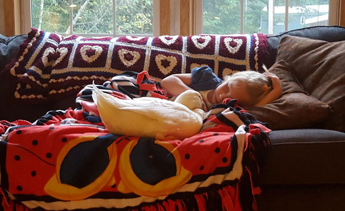 „L-am adus acasă, pe acest galben şi ghem mic de puf, care măcăia într-o cutie. Kylie se tot învârtea în jurul cutiei, iar când s-a uitat în interior, ţipătul răţuştei a încetat. Oriunde s-ar duce Kylie, raţa merge după ea şi e liniştită, iar dacă fata dispăre din raza vizuală, Snowflake ţipă şi se panichează”, povesteşte Ashley Brown, mama lui Kylie.