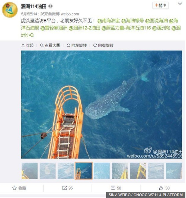 În China, muncitorii de la pompele de ulei de lângă Insula Weizhou, la sud de provincia Guangxi, au postat fotografiile unui rechin balenă (Rhincodon typus) pe social media, explică BBC. În imagini, muncitorii au etichetat un „vechi prieten”.