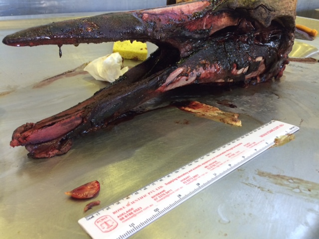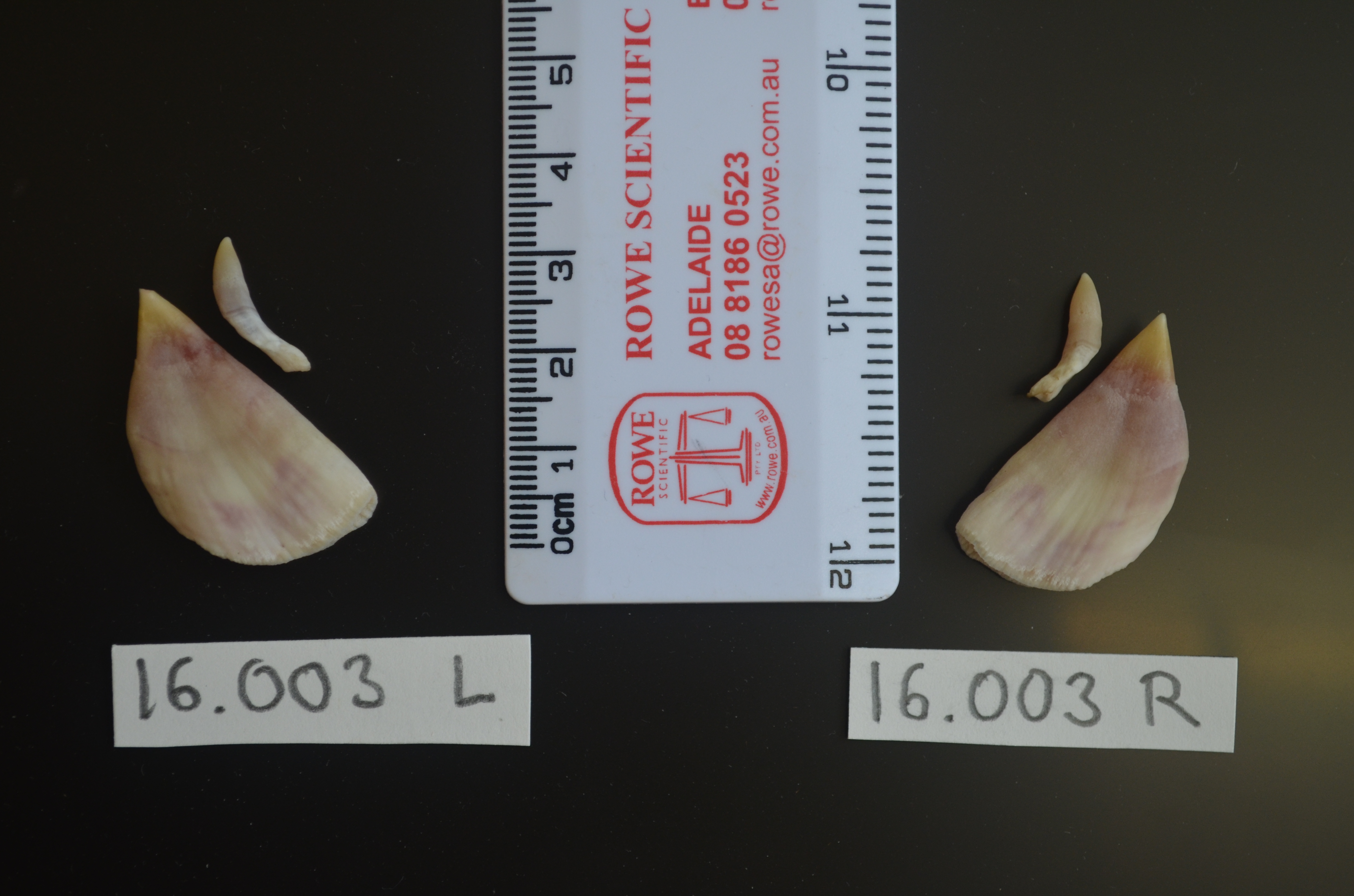 După ce cadavrul a fost dus la Muzeul Australian de Sud, cercetătorii au putut să separe craniul de carne şi să observe cei doi colţi vestigiali ieşind din maxilar.