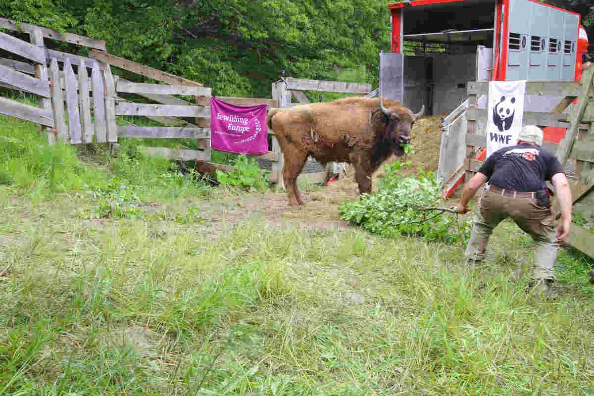Cele zece exemplare au sosit sănătoase, în ciuda stresului imens cauzat de călătoria lungă de 5000 de km şi au fost eliberate într-o zonă de aclimatizare de 15 hectare. Primii paşi ai zimbrilor în România nu au fost lipsiţi de peripeţii. Vremea neprielnică şi ploaia torenţială din noaptea precedentă şi-au lăsat amprenta pe drumul forestier şi podul din faţa zonei de aclimatizare unde se descarcă caminoanele ce au transportat animalele. Prin urmare, acestea nu au putut fi aduseîn poziţia ideală şi ceea ce ar fi împiedicat transferul zimbrilor în noua casă. Cu puţină ingeniozitate şi implicare, localnicii, cot la cot cu reprezentanţii WWF România şi Rewilding Europe, au amenajat un culoar de trecere peste podul ce legă camioanele de ţarc, format din maşinile localnicilor, bandă reflectorizantă, câteva hrănitoare, pături, banere şi trei porţi demontate temporar din zona ţarcului de control veterinar. Imposibilul a devenit posibil mulţumită colaborării deosebite dintre oamenii de conservare şi comunitatea locală pentru care zimbriireprezintăo parte din ce în ce mai importantă din viaţa lor.