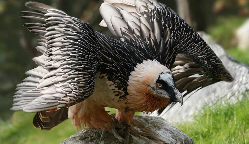 Este o pasăre maiestuoasă, cu un penaj ce îmbină portocaliul ruginiu cu negrul într-o combinaţie inegalabilă. Este unul dintre cei mai mari vulturi din lume. Atinge penajul de adult după cinci ani. Păsările tinere au o culoare închisă. Se hrăneşte la fel ca majoritatea vulturilor cu hoituri, însă ca particularitate, se hrăneşte în proporţie mare cu măduva oaselor acestora. Aruncă oasele de la înălţime pe stânci, pentru a le sparge, apoi le înghite.