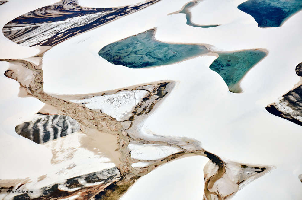 Nisipul alb din Parcul Naţional din Brazilia, Lencois Maranheses, poate fi utilizat ca o pânză pentru picăturile de ploaie care sculptează cele mai vibrante şi efemere lagune pictate de bacteriile colorate. Pentru a obţine această imagine, fotograful a plănuit momentul timp de doi ani.