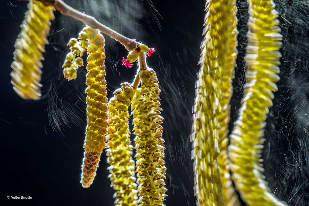 În imagine se pot observa detaliile florilor dintr-un alun, atât florile feminine, cât şi cele masculine. Fiecare ghirlandă eliberează cantităţi mari de polen, la începutul anului fiind transportat de vânt