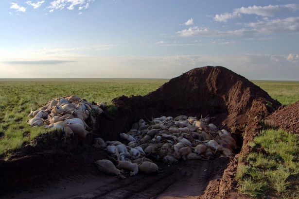 Imaginile prezintă un morman uriaş de antilope Saiga moarte, pe care echipele guvernamentale le-au îngropat pentru a opri răspândirea patogenului către alte animale.
