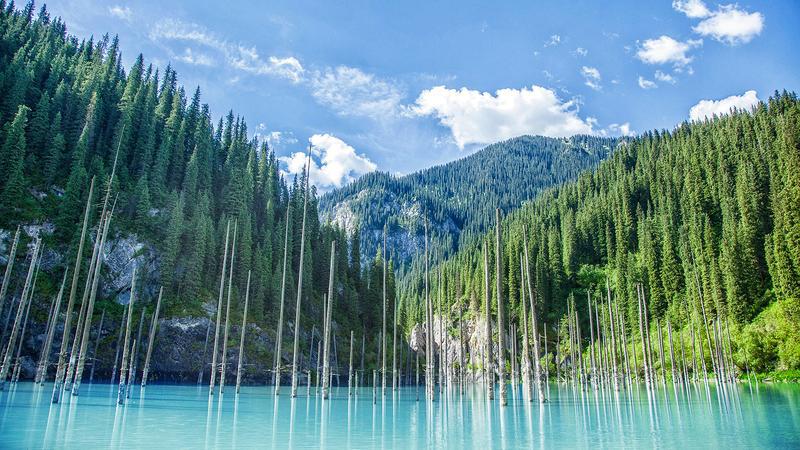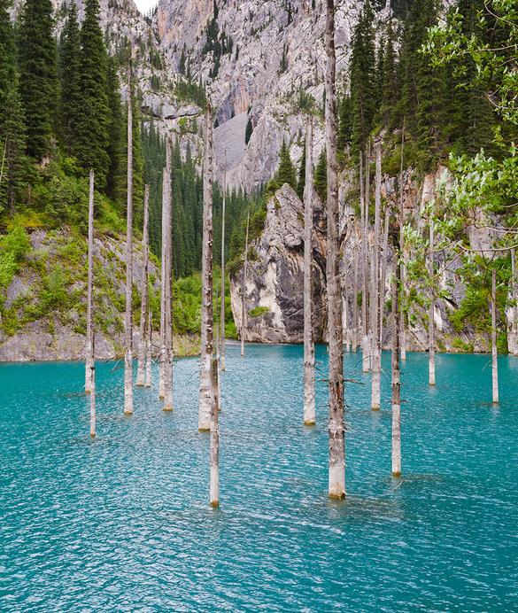 În 1911, un cutremur a produs o alunecare de teren în Munţii Tian Shan, care a blocat o trecătoare şi a format o barieră naturală. De-a lungul timpului, ploile au inundat valea laolaltă cu pădurea de pini, scrie Curiosity.