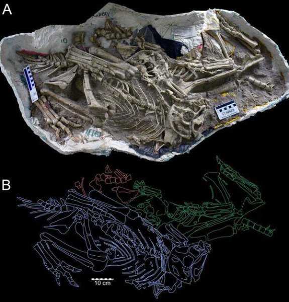 Noua dovadă a acestui comportament provine dintr-o fosilă confiscată care a fost exportată ilegal din Mongolia şi care prezintă rămăşiţele excelent conservate a trei dinozauri juvenili cunoscuţi ca oviraptori, linia dinozaurilor care a dus la apariţia păsărilor, scrie Science Daily.