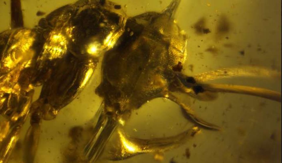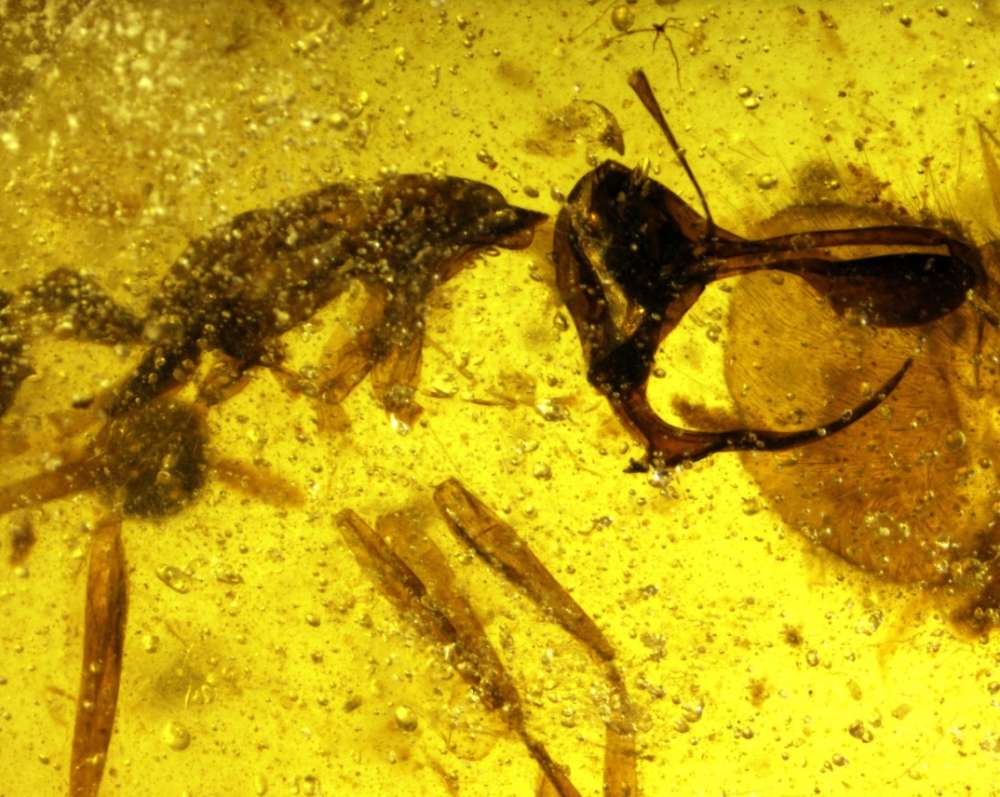 Între fălcile acesteia se află tuburi cu care, susţin cercetătorii, insecta ar fi supt lichidul din pradă. Rămăşiţele furnicii au fost descoperite lângă un cărăbuş şi el prin în chihlimbar.