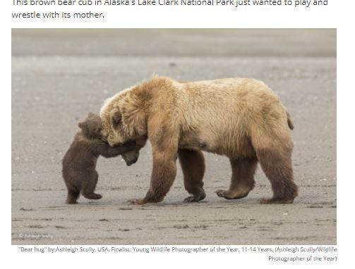În această imagine este prezentat un pui de urs brun din Parcul naţional din Alaska care se joacă cu mama sa.