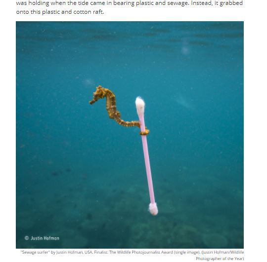 În imaginea de mai jos este prezentat impactul omului în natură. Un mic cal de mare din apropierea insulei Sumbawa, Indonezia, se ţine de un beţişor de ureche în momentul apariţiei mareei.