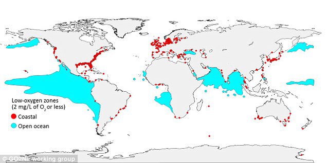 Conform unui studiu recent, ”zonele moarte” au crescut de până la patru ori în ultimii 50 de ani. Mail Online notează că regiunile nu vor înceta să apară deoarece temperaturile de pe Pământ continuă să crească.